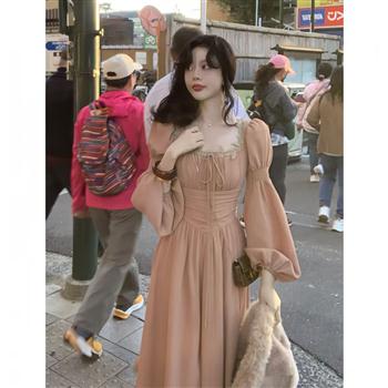 YF6349-(2色入内)法式方领泡泡袖叶子贴边套头系绳束腰设计感复古连衣裙