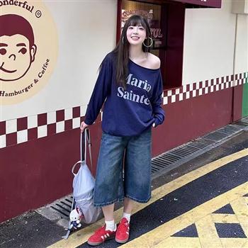 YF6344-图片色新款慵懒风破洞02字母印花直筒坠地感阔腿复古牛仔裤