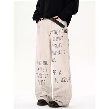 YF6353-图片色非主流个性涂鸦字母印花高腰直筒坠地感港式大码牛仔裤